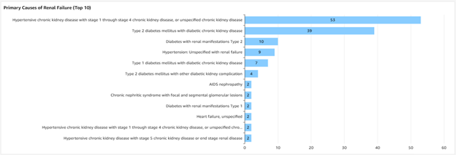 | The Patient Roster Dashboard also provides graphs displaying Patient Count by Primary Dialysis Type (Figure 14), Patient Count by Dialysis Setting (Figure 15), and the top 10 Primary Causes of Renal Failure (Figure 16). |