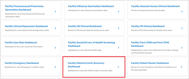 | Figure 2. Selecting Facility Patient Events Summary Dashboard