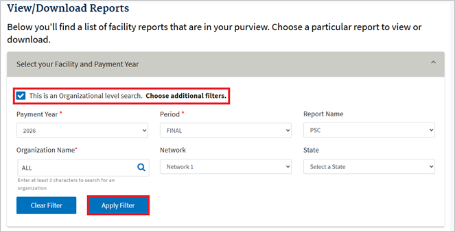 | 5. Select View/Download Reports. 6. Select a facility using Facility Name, Facility CCN, or Dialysis Organization. 7. Select 2026 for Payment Year, Final for Period, and under Report Name, choose the report you would like to view or download. 8. Click Apply Filter. |