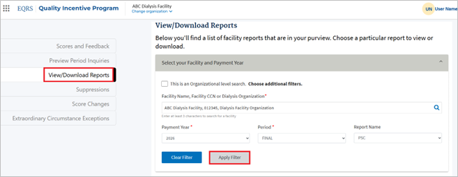 | 5. Select View/Download Reports. 6. Select a facility using Facility Name, Facility CCN, or Dialysis Organization. 7. Select 2026 for Payment Year, Final for Period, and under Report Name, choose the report you would like to view or download. 8. Click Apply Filter. |